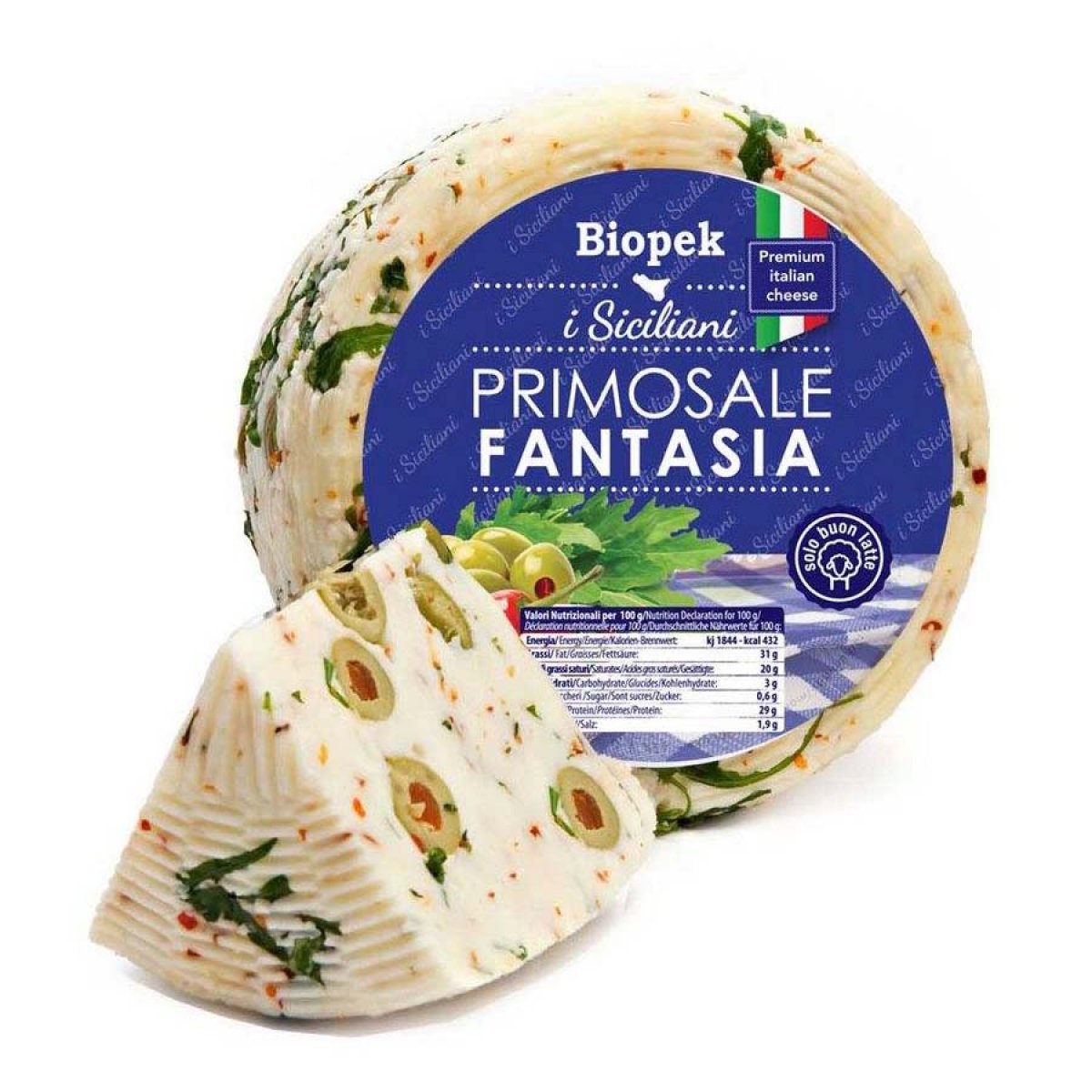 Składniki: Mleko owcze pasteryzowane, mleko pasteryzowane, oliwki nadziewane papryką 7% (oliwki 81%, pasta paprykowa 18%, sól, woda), rukola 1%,pikantna papryka, sól, podpus. Może zawierać orzechy włoskie, pistacje.